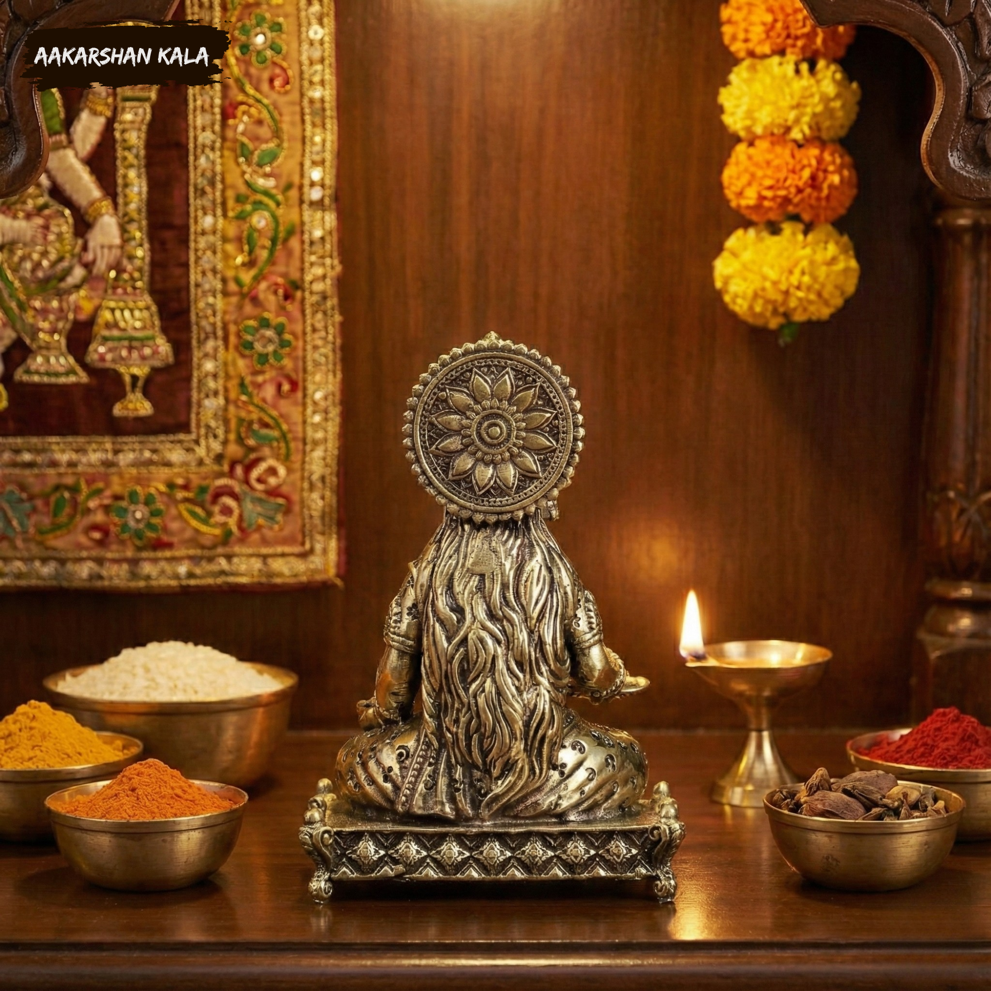This superfine brass sculpture features detailed carving work, traditional iconography, and a lightweight finish that makes it perfect for compact pooja rooms, home temples, altars, meditation corners, or gifting.